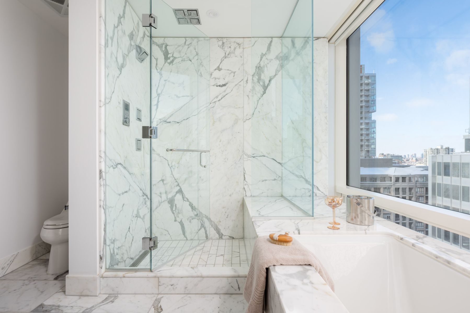 The spacious primary bedroom easily accommodates a king-size bed and features a large walk-in closet, all while offering stunning views along University Avenue. The spa-inspired five-piece marble bathroom, wrapped in floor-to-ceiling corner windows, is bathed in natural light. A deep soaker tub provides a rare opportunity to unwind while taking in city views—an indulgence seldom found in downtown condominiums.