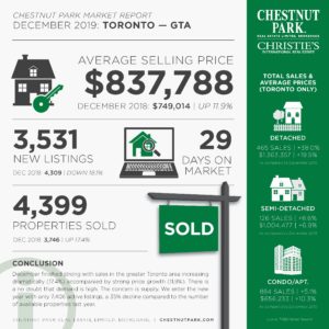 The average sale price in the City of Toronto was even higher coming in at $885,132, an exceptionally high number for the month of December when sales of higher-priced properties decline. This increase was driven by the sale of 465 detached properties sales having an average sale price of $1,363,477, a 19.5 percent increase compared to the number of detached properties that were reported sold in December of 2018.