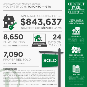 As we head to the end of the year, demand in the greater Toronto area remains strong, even though average sale prices are approaching record highs. The concern is and will be supply. With only 11,958 residential properties available to buyers, all eyes will be on the new supply that comes to market in 2020. Hopefully the record average sale prices will cause sellers to capitalize on the strong alue of their properties, motivating them to bring them to market.