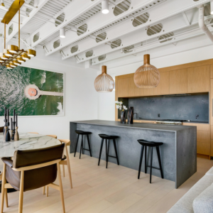 A modern 2,000-square-foot penthouse near Dundas West station. The three-bed, three-bath unit has a Scandinavian-style interior, with a light colour palette and sculptural furniture. It also has a 1,600-square-foot wrap-around rooftop terrace.